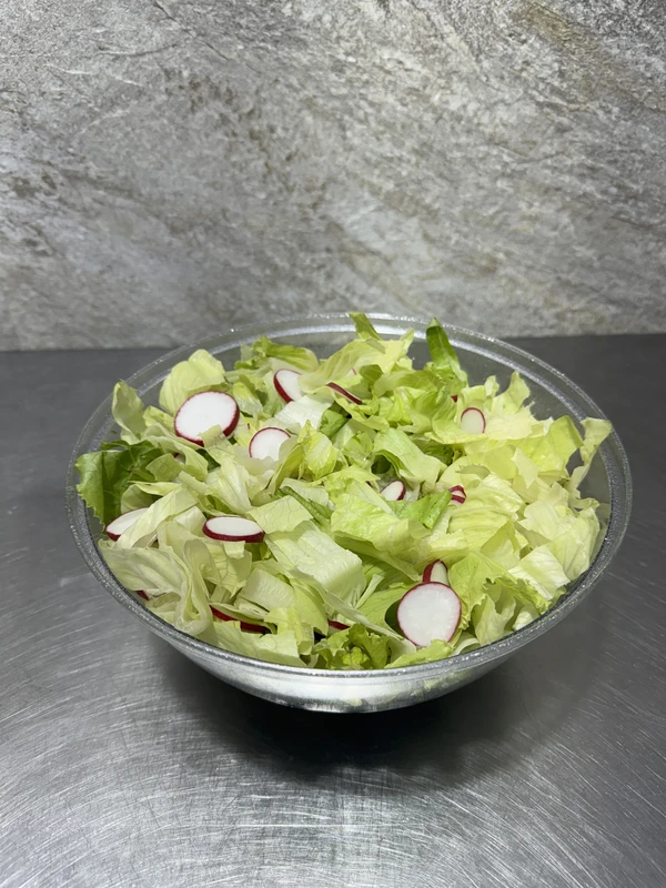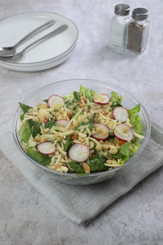 מיקס חסות,צנונית פרוסה,גבינת פרמזן וקרוטונים אפויים מוגש לצד רוטב קיסר קלאסי