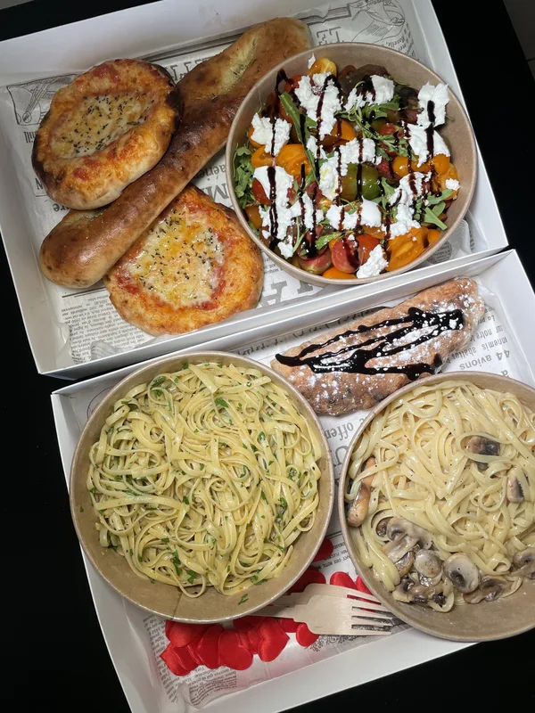 - 2 מנות פסטה פטוצ'יני עם רוטב לבחירה (שמנת פטריות,רוזה,שמנת ובטטה,פסטו)